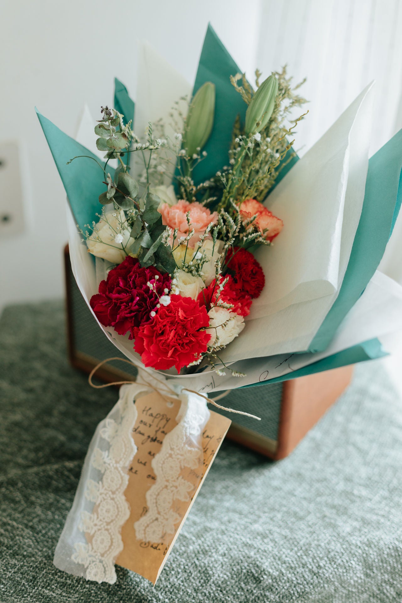 Our vibrant carnation bunch is an array of colour, beautifully wrapped in aqua green paper adorned with delicate lace and a ribbon that whispers love — the perfect gift to brighten any day with a touch of charm and sophistication.