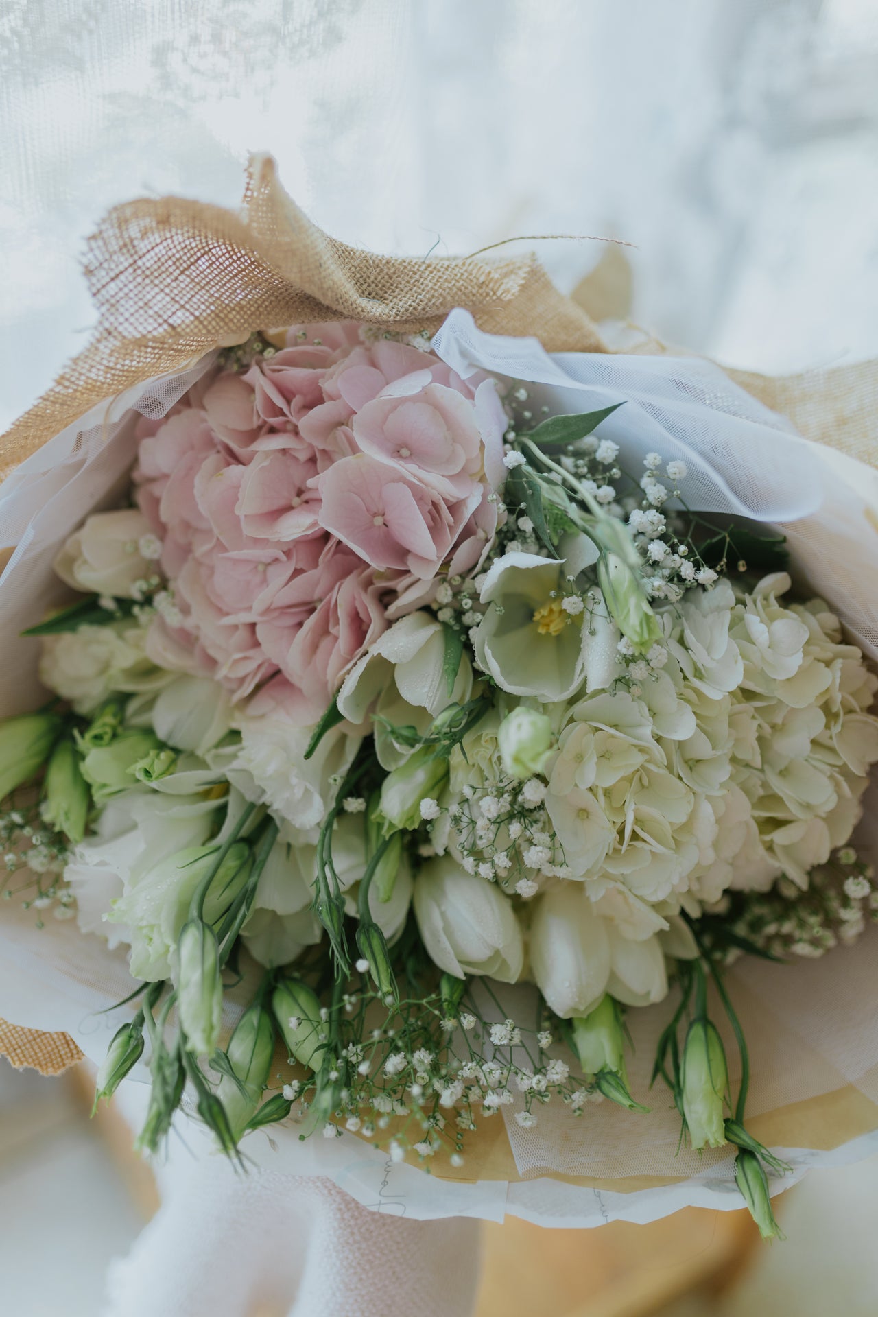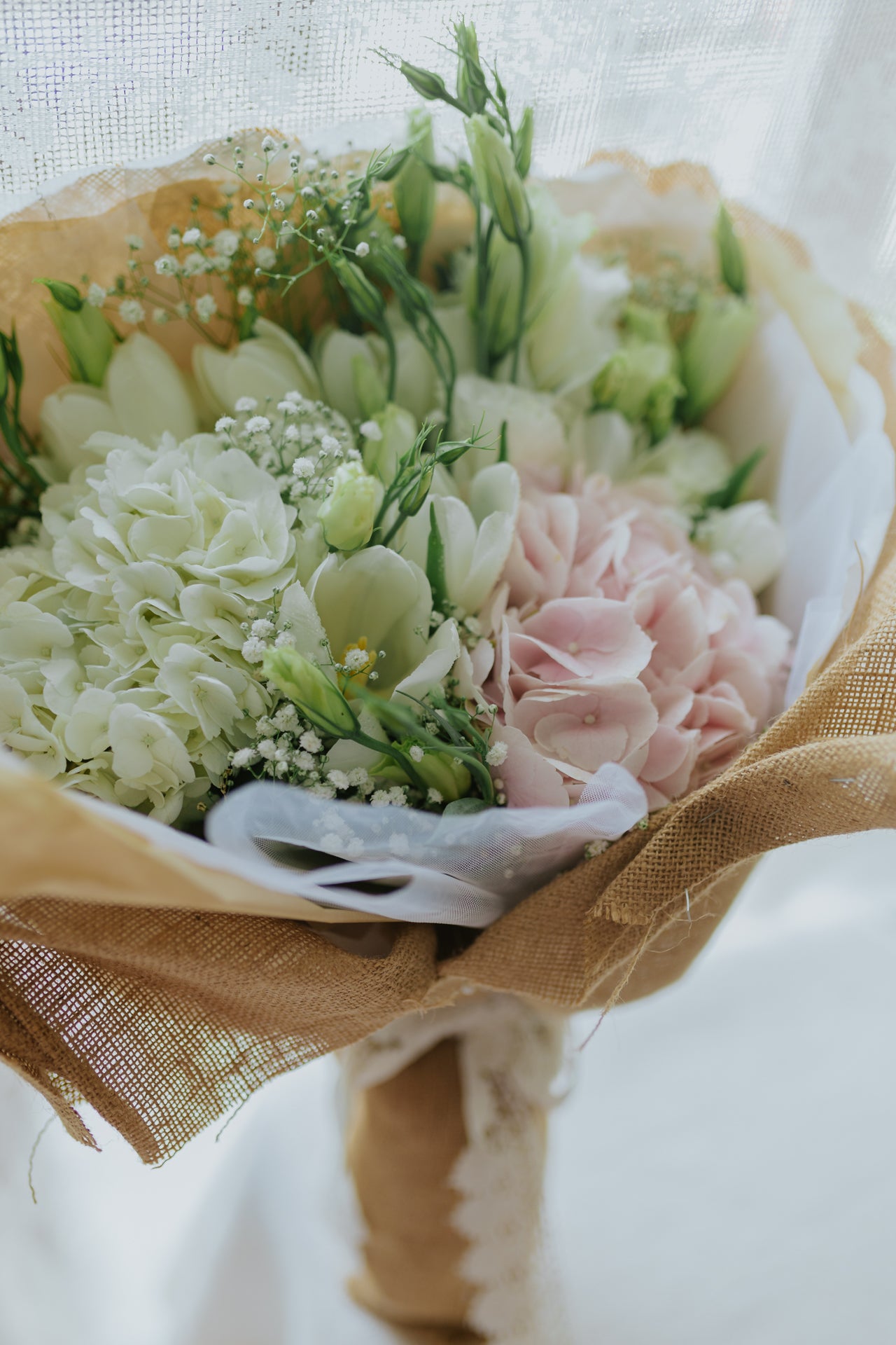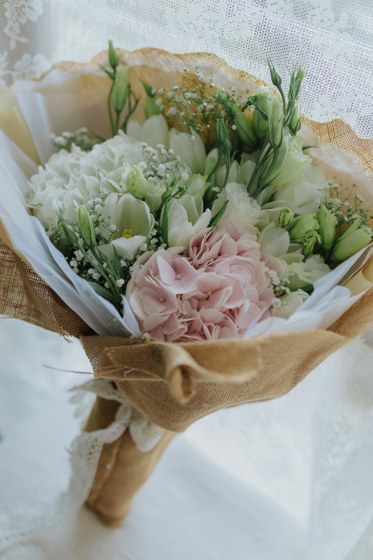 - Flower Details: Hydrangea (2 Stems), Tulips (10 stems), White/Pink Eustomas, and Baby's Breath wrapped in jute