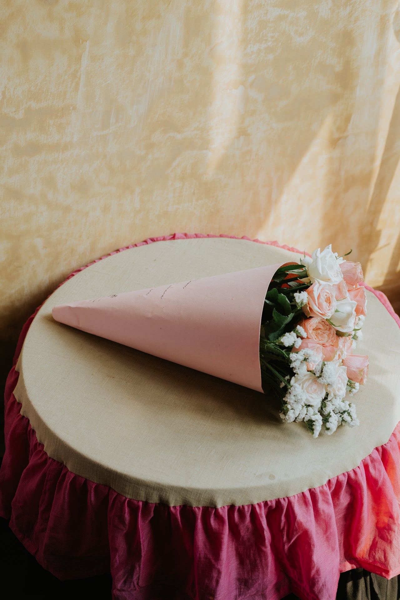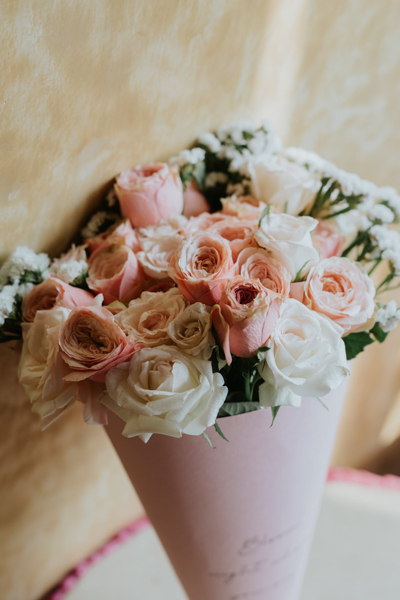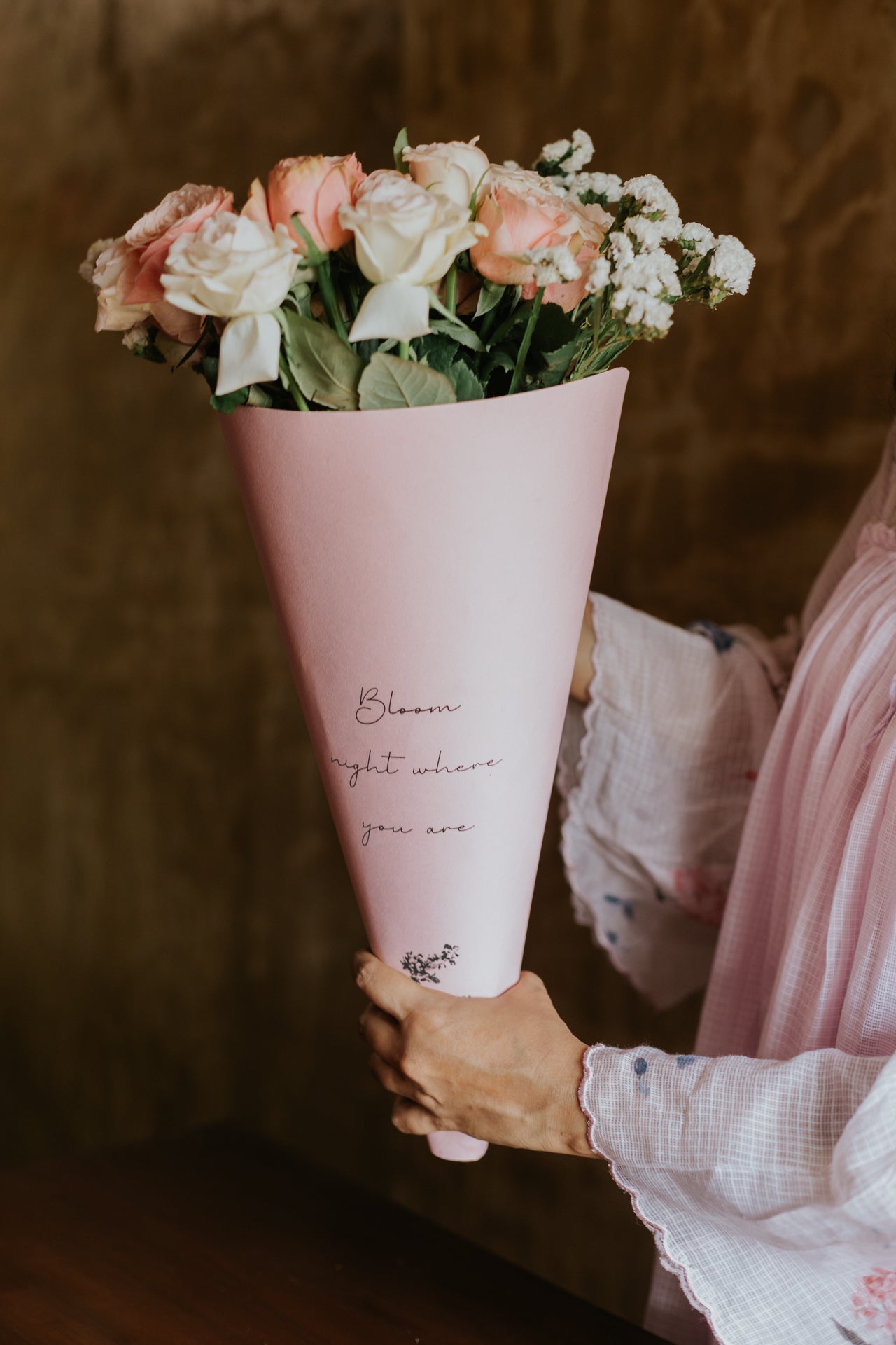 This cone bouquet is for the ones who appreciate the quiet kind of beautiful where every bloom feels intentional and every petal tells a story. A curated mix of blush pink garden roses and delicate white statice, nestled into our signature blush cone. It doesn't shout. It simply stays with you.