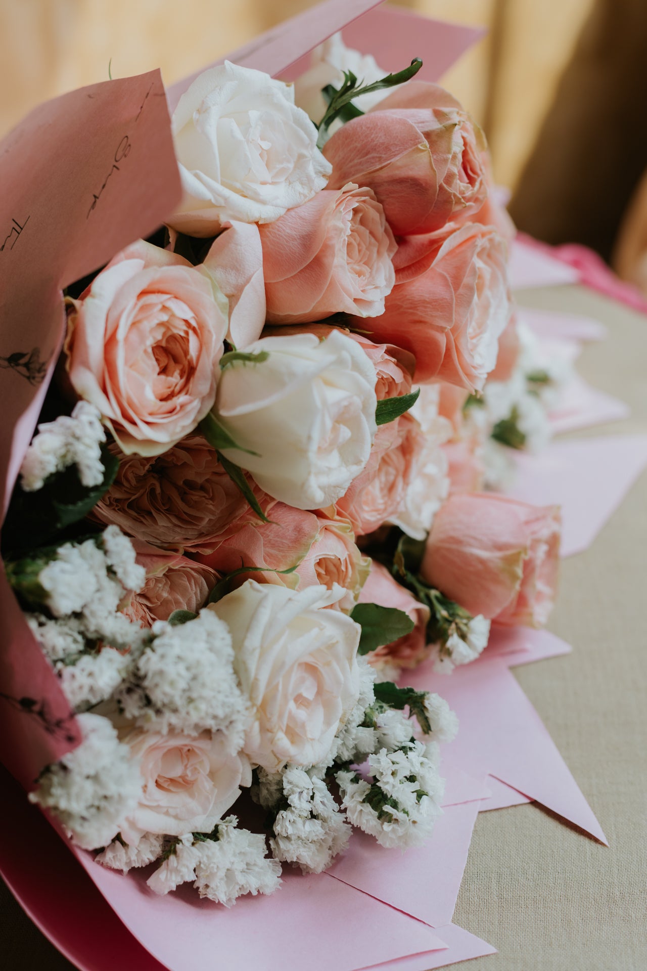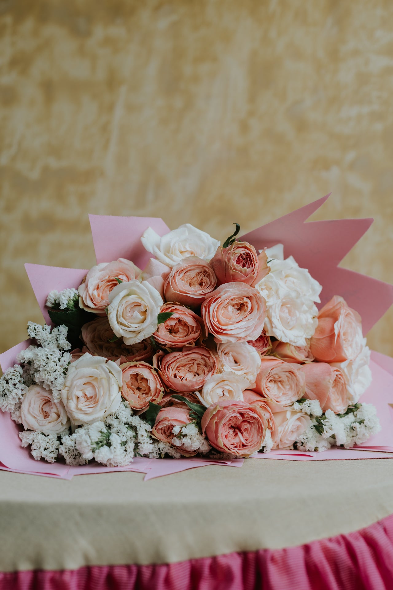 What's Inside: Fresh Pink, Butter Pink Peony Roses with White Roses and Statice, hand-arranged in our signature printed blush cone wrap.Â
