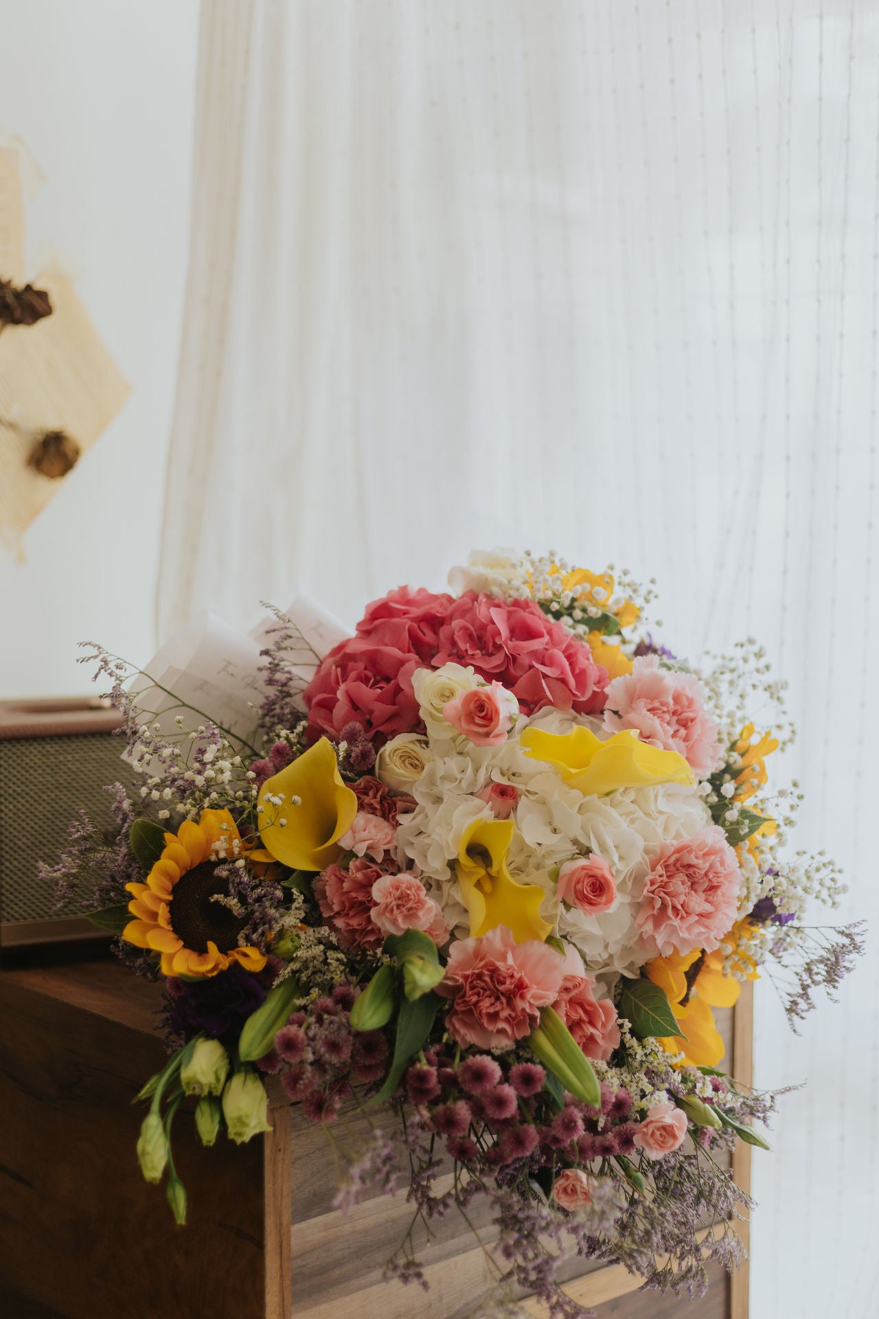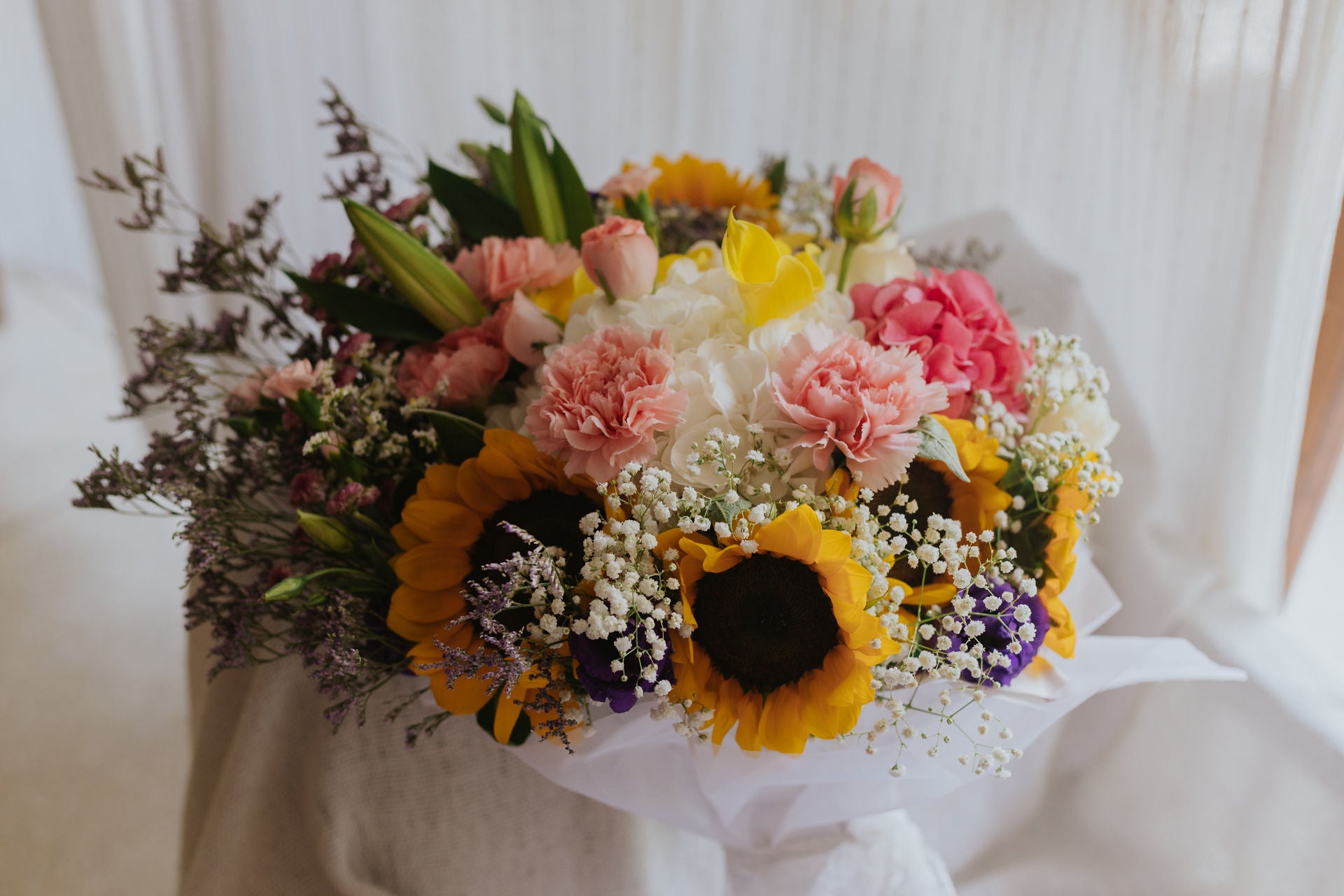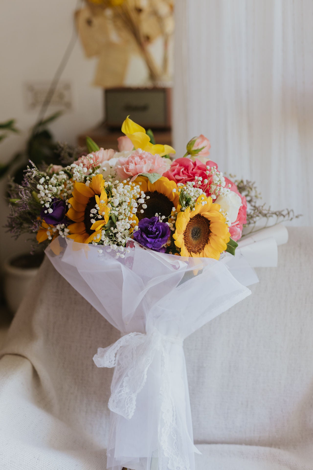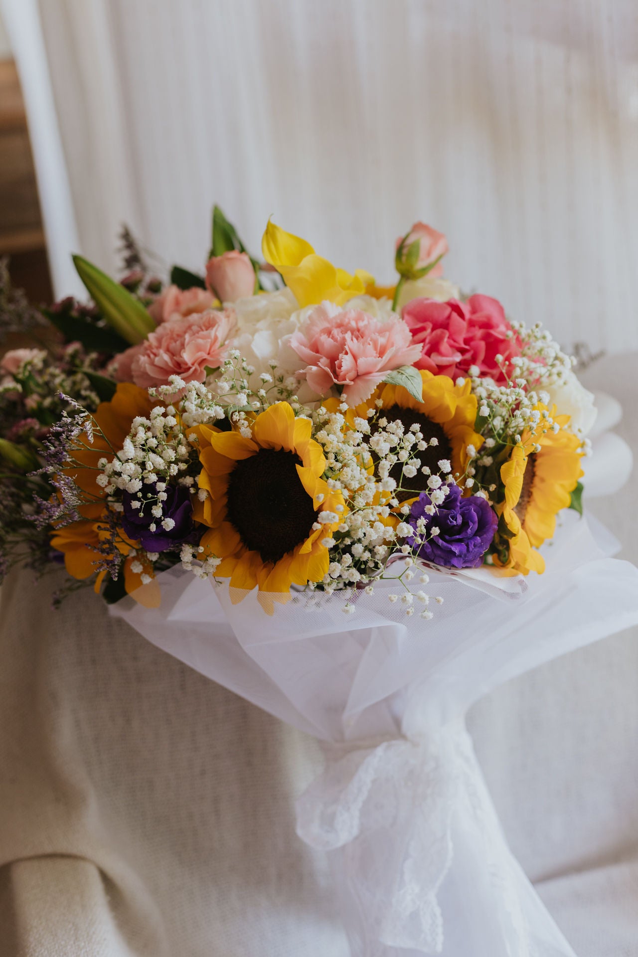 - Flower Details: 2 stems of hydrangea, sunflowers, eustomas, roses, lilies, carnations, daisies, baby's breath and limonium.