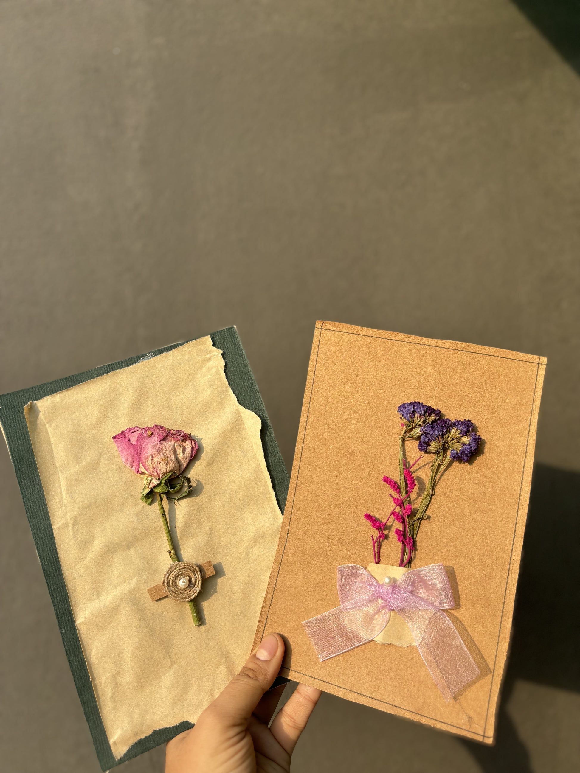 A combo of 2 dried flower postcards, each featuring a unique floral design. Blank on the back for your message.