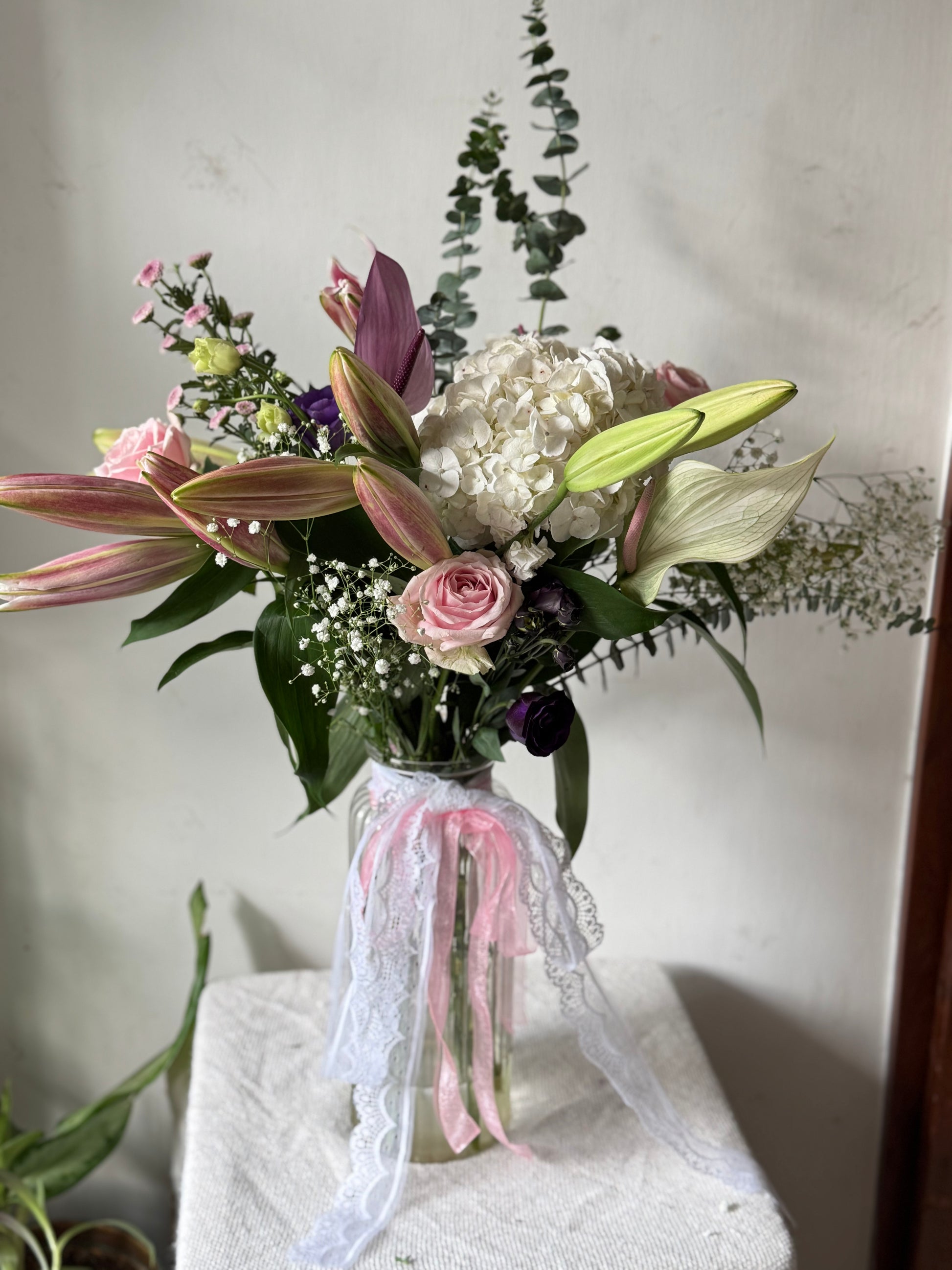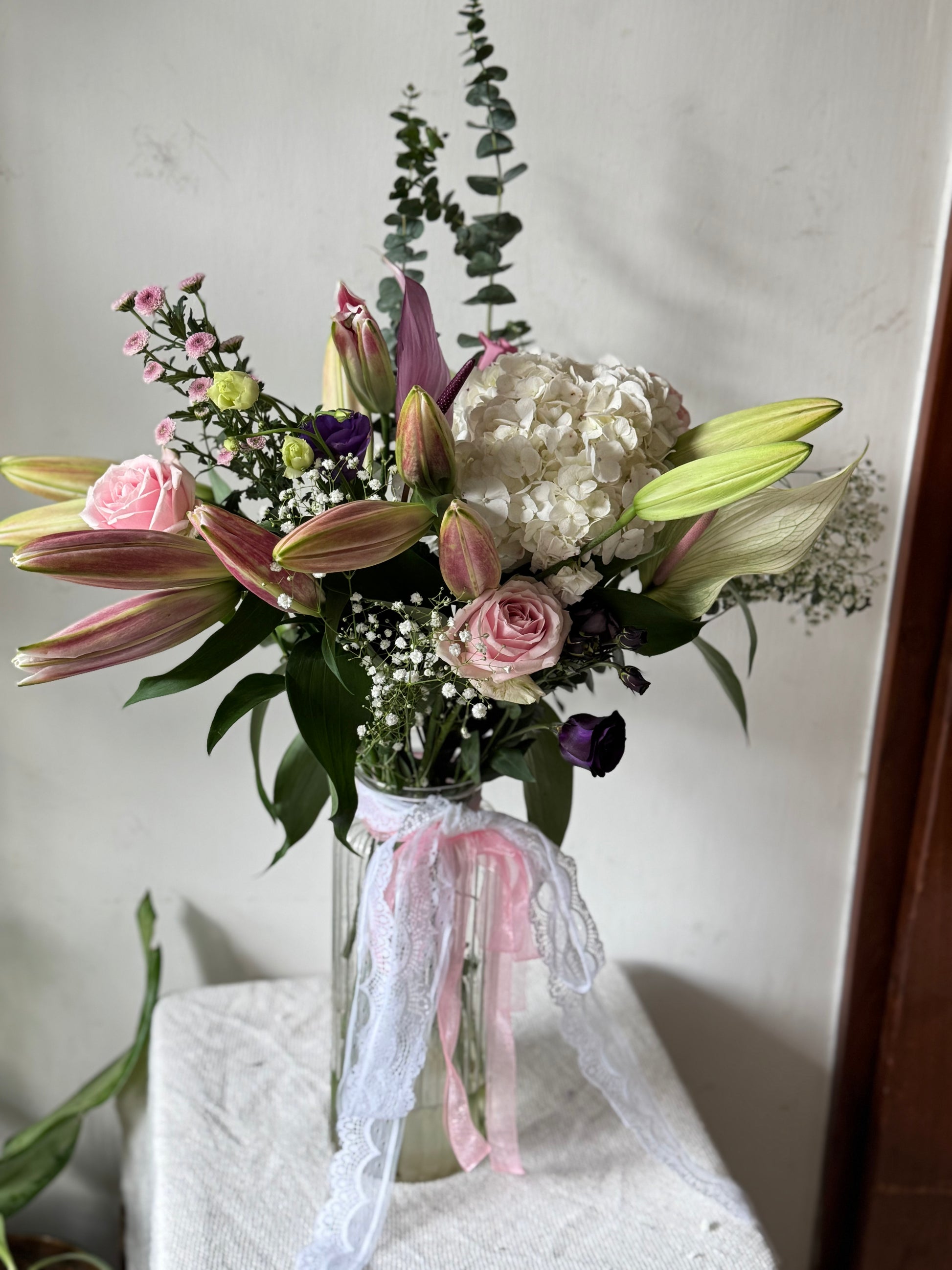 Fresh Lilies, Roses, Hydrangea, Daisies, Gypso & Eucalyptus, hand-arranged in our signature plastic-free wrap.