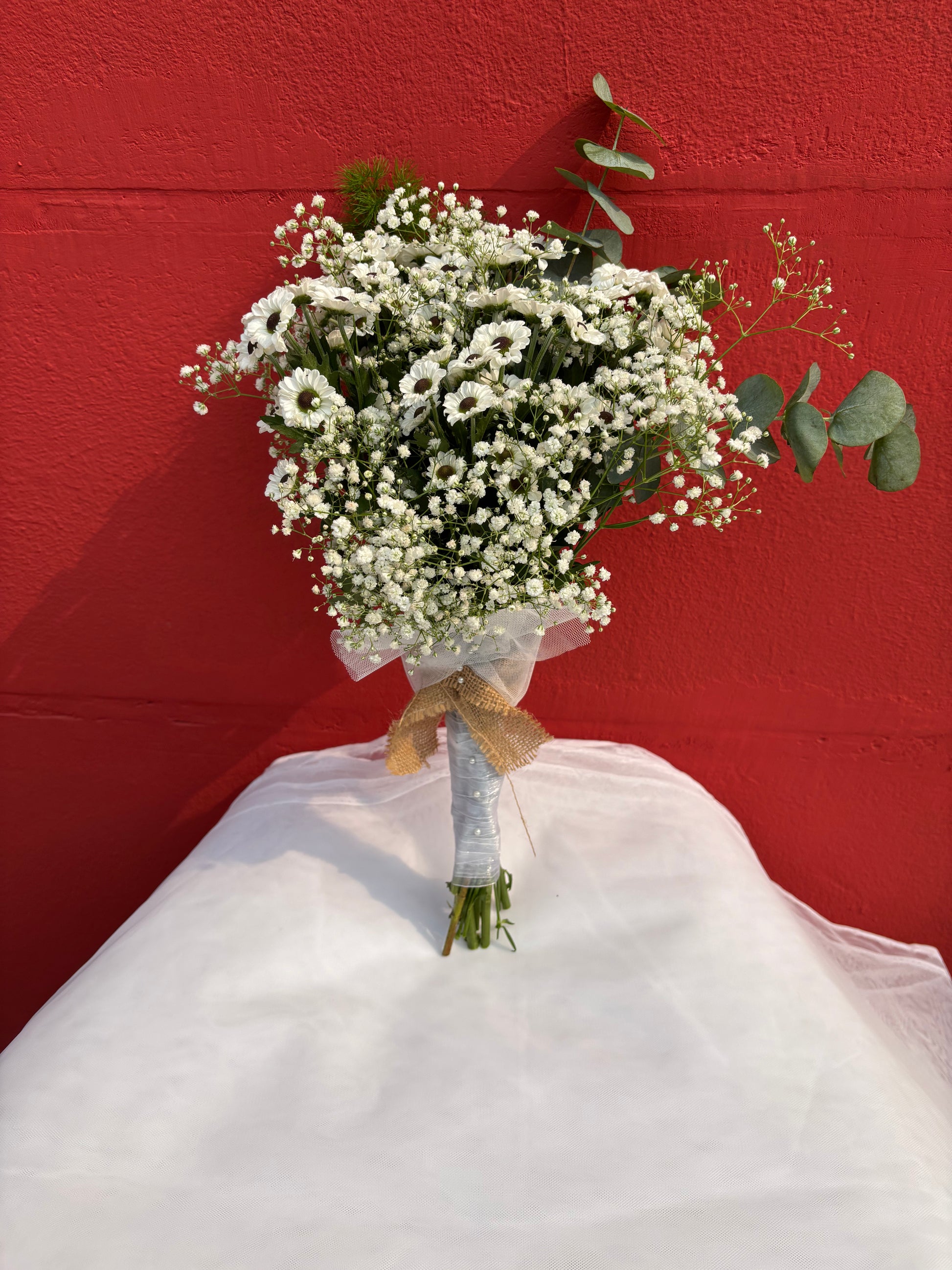 White Santorini daisies paired with soft clouds of gypso — a bunch that feels like sunshine and sea breeze wrapped in paper. Perfect for birthdays, celebrations, or just to make someone’s day bloom brighter.