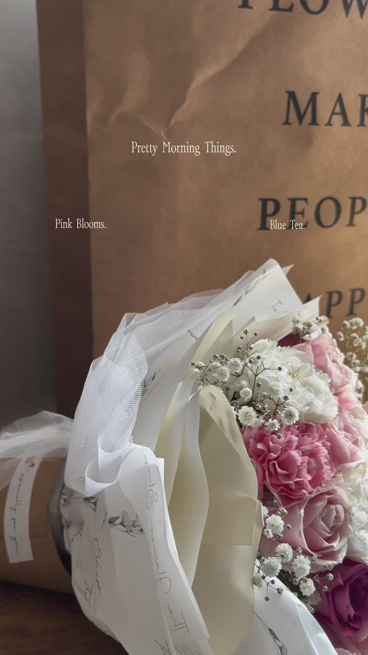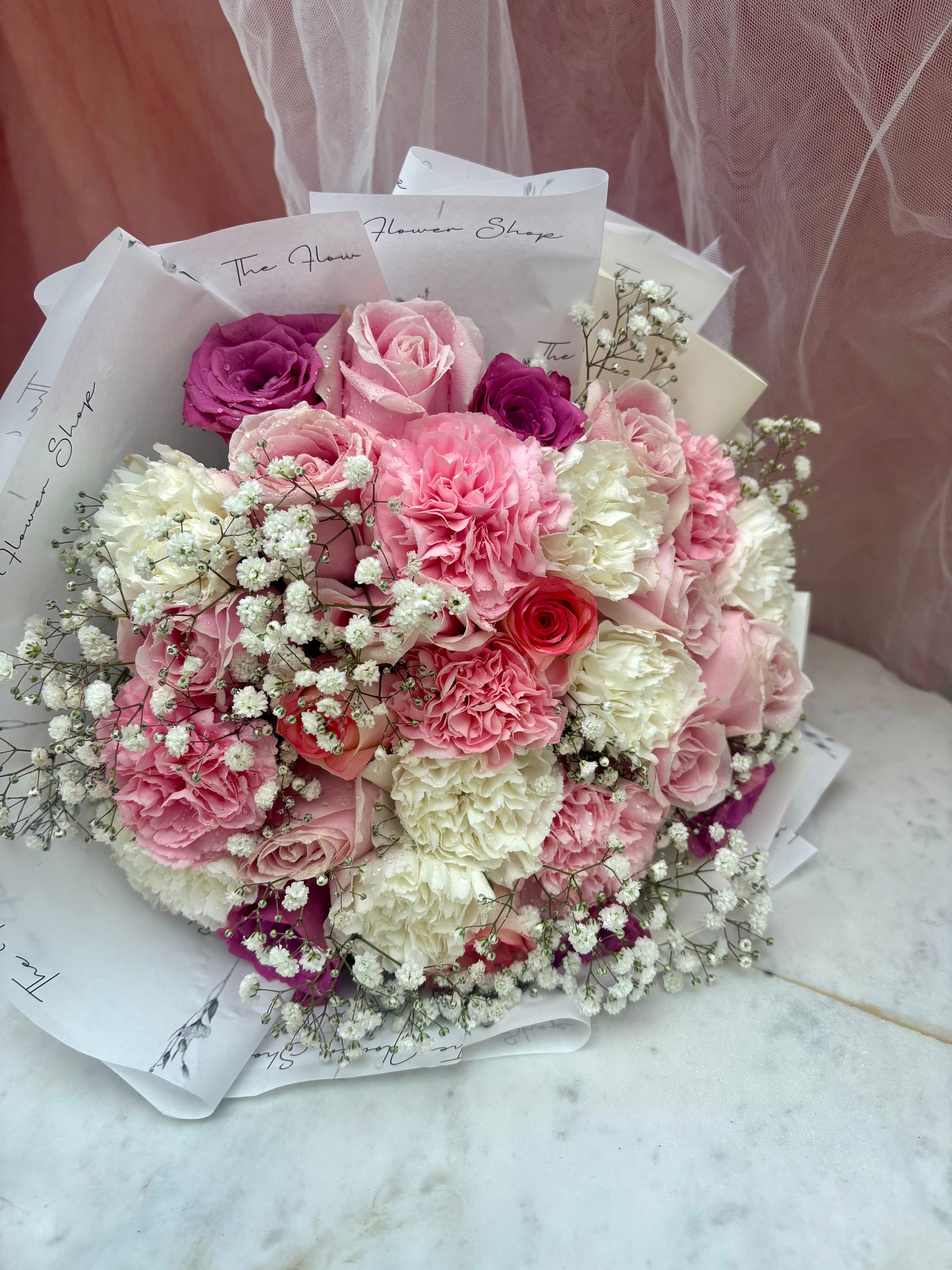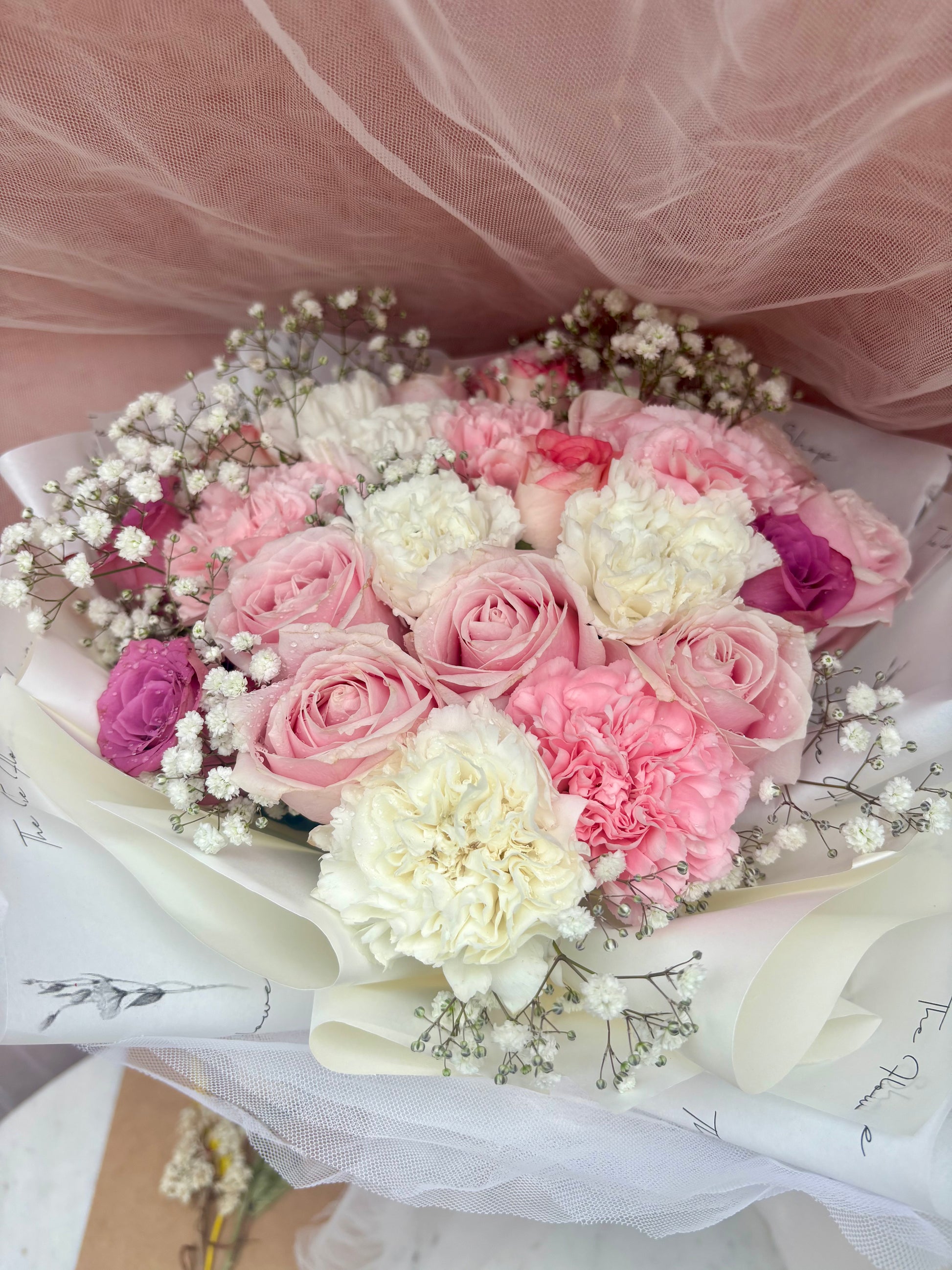 A handpicked mix of pastel pinks and whites — think roses, carnations, daisies, and baby’s breath — wrapped in our signature plastic-free cone.