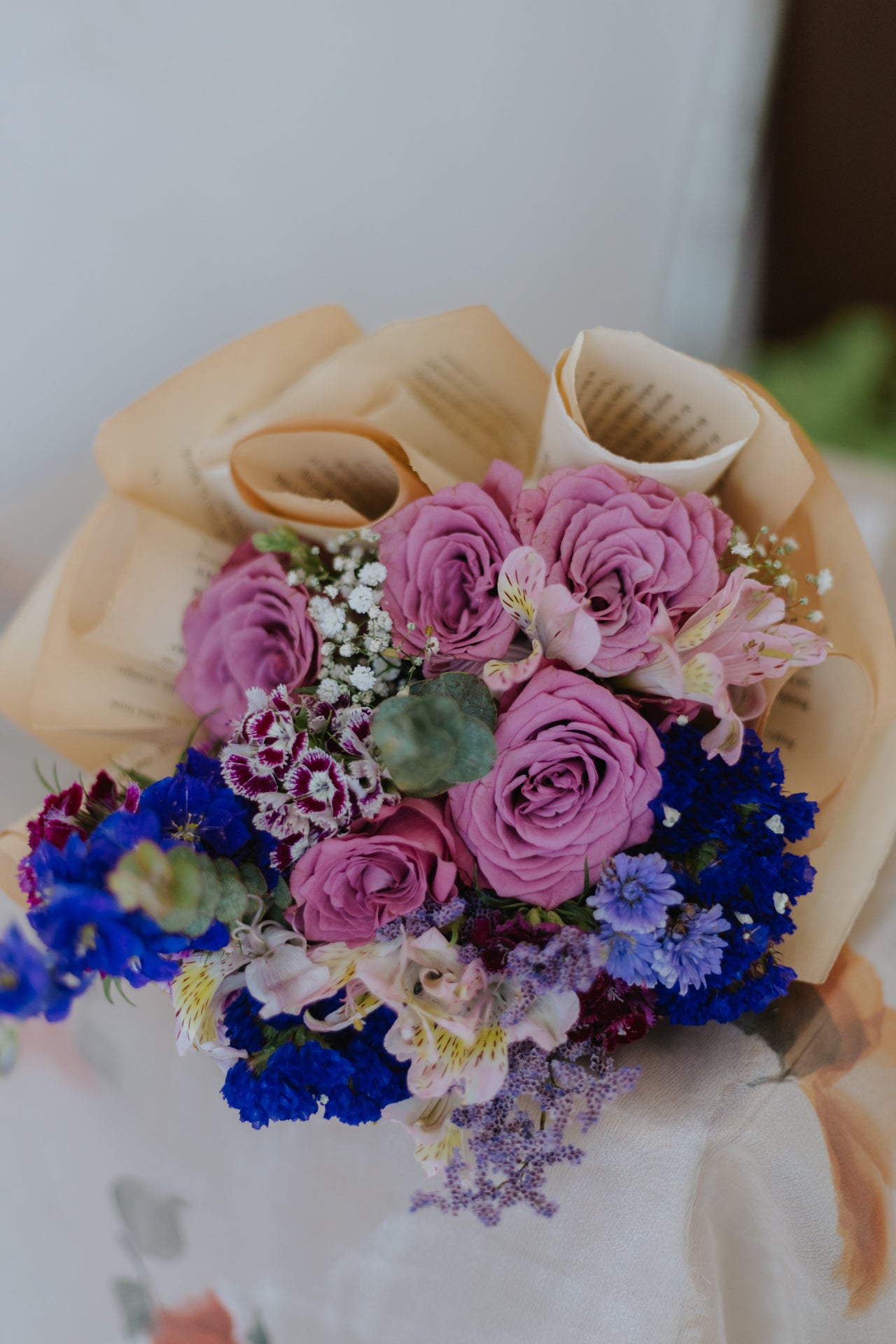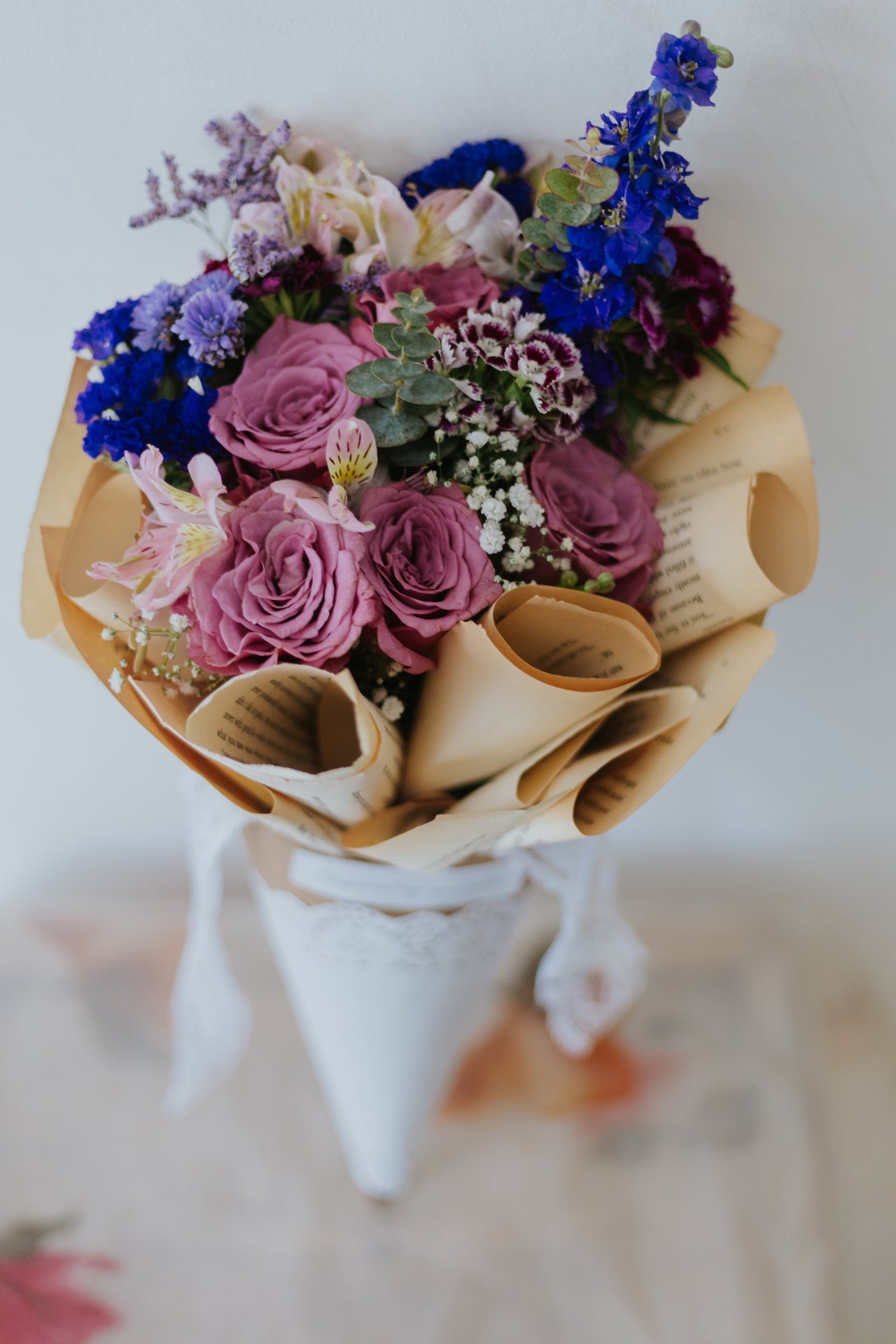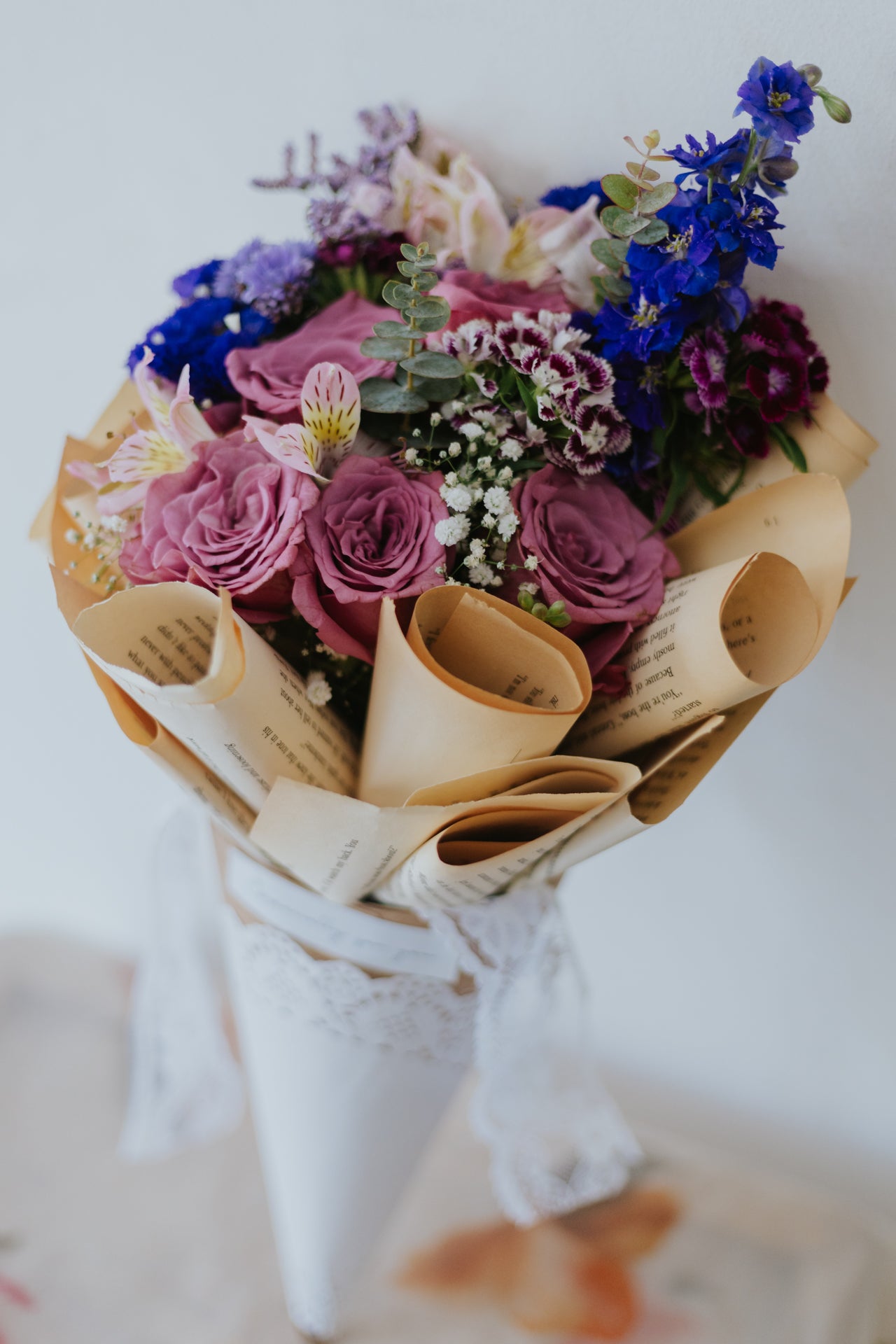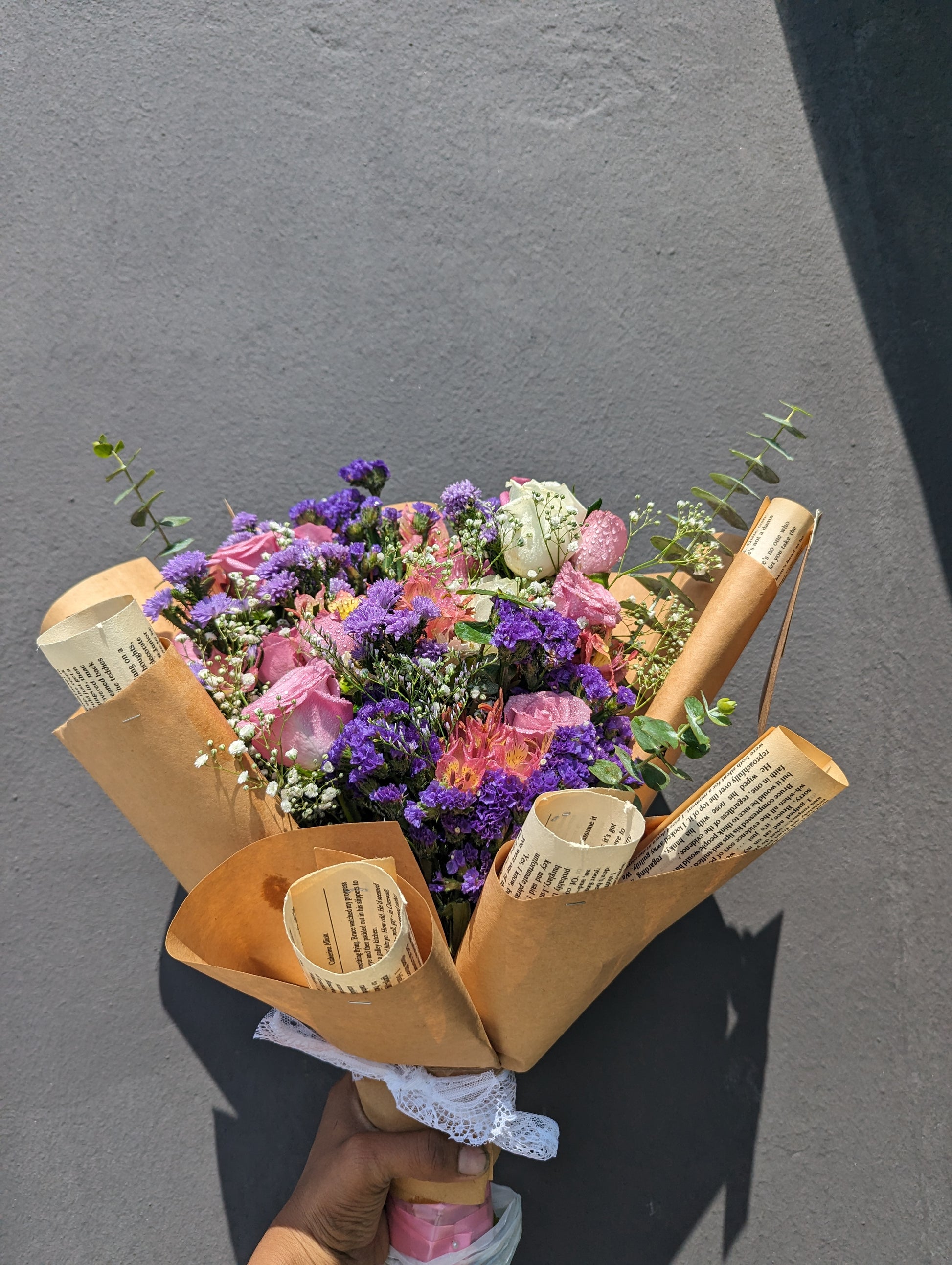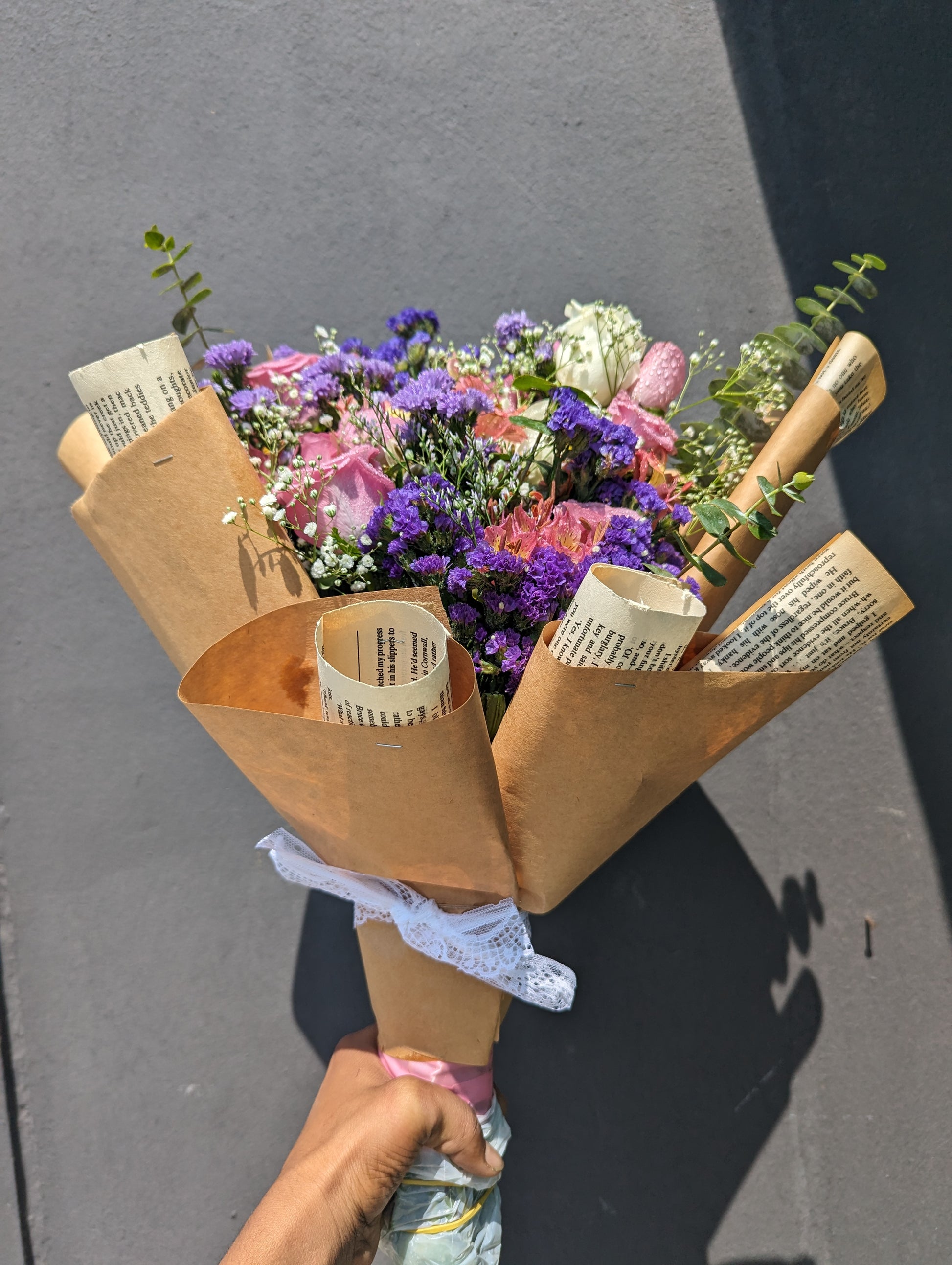Enveloped in vintage paper and delicate lace, this bouquet is a visual masterpiece that marries the past with the present. A harmonious blend of diverse blooms in their full glory, it's a tribute to nostalgia.